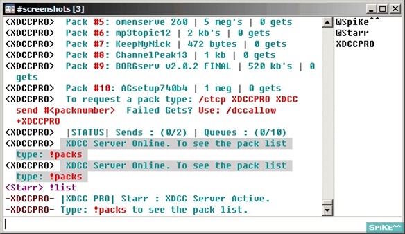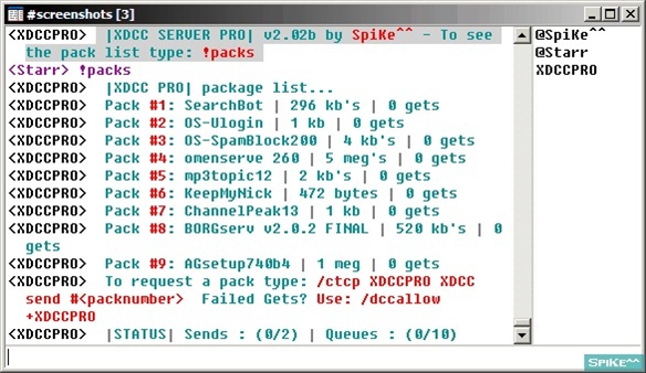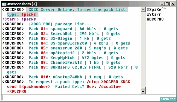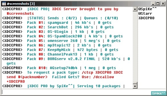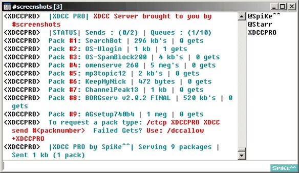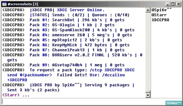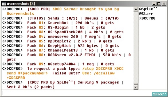 XDCC Pro Server is a Complete XDCC Server Script supporting unlimited packs, multi channel serving, banlist, extensive channel ad options, preset color themes or choose no color, sends only to users on a server channel, kills send if a user leaves the channel, flood control, file send queue, and much more. Most settings done via DCC chat.